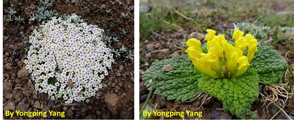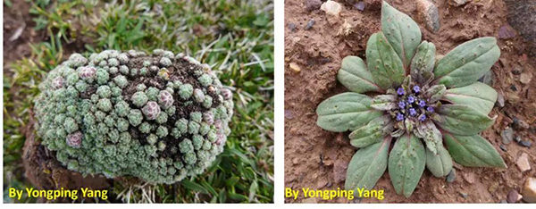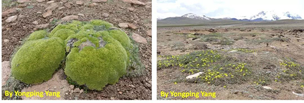 矮小的囊种草(左)和金露梅(右)(图片来源:作者拍摄) 提到植物的矮化,我们最先想到的是高山流石滩上的“垫状植物”。“垫状植物”是对具有球形或半球形表面的植物的总称,有极端缩短的茎、密集的叶或者小枝,是植物经过多年辐射性生长而形成的紧密簇生结构。垫状植物的寿命很长,在高海拔生境内,垫状植物是最具代表性的高度特化植物生活型的模式种类。羌塘高原最常见的垫状植物有囊种草(Thylacospermum caespitosum)、无心菜属(Arenaria)、点地梅属(Androsace)、垫紫草属(Chionocharis)和委陵菜属(Potentilla)等类群。 这些植物呈垫状或者密集匍匐状生长,不但适应了羌塘高寒、强旱等极端环境,还会改善生长位置及周边生境的土壤理化性质、营养成分和水热条件,由此形成了垫状植物内部相对较为良好的微环境,而这种微环境的改变能够显著提高群落水平的物种多样性和丰富度,在群落物种组成和结构方面起着重要的调节作用。