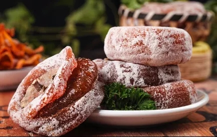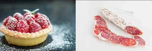 巧克力的“长霉”,冬瓜糖的“返砂”,现烤糕点上那一层诱人的“甜粉”,其实都是一种糖霜。生活中常用的糖是蔗糖,它会以三种形态呈现:冰糖、白砂糖、红糖。 高温将糖 “熬化”(液态)并撒在低温物品(菜肴)上,由于热量迅速散失而在表面重新结晶形成“小糖晶”,进而呈现出薄薄的白雾状,和自然界中的“霜”很像,因此被称作糖霜,也叫“反砂”。如果“熬化”后继续加热,糖会发生“焦糖化反应”,颜色变深并粘稠起来,再撒到低温物品上,就只会形成琥珀色的“糖壳”,也就是常说的“琥珀XX”菜品的由来;如撒到高温物品上,由于热量散失慢会呈现出粘稠的糖浆状,当夹起菜肴来,附着的糖浆会迅速冷却呈现出固态,这就是奇妙的“拔丝”了。 盐霜的产生和糖霜类似,也是盐分浓度过高或者在物体表面析出的结果。 而脂霜的形成则需要“机缘巧合”,并非所有的油脂都可以起“霜”。油脂是一类具有长链的烷烃酯类成分,常温下液态称油,固态曰脂,饱和度越高,越容易呈固态,比如猪油、牛油;而随着温度的降低,油也会呈现固态(如低温下花生油有凝固的沉淀)。 因此脂霜形成是温度、油脂成分比例、以及环境中其他因素共同作用产生的。如常温下牛肠风干后容易出现“脂霜”,而其他部位则呈现出“油状”。冬季制作的香肠,风干后表面形成一层蜡样“脂霜”。 糖和油脂起霜的过程和物理学原理可参看“夏天过去,我的巧克力为啥白了头?”一文,在此不再详述并忍痛删除一万字。