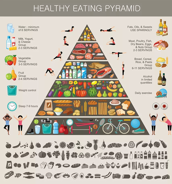食物营养金字塔(图片来源:Veer图库) “水果代餐”,这是近些年流行起来的减肥妙招。但用高含糖量、低脂肪的水果代餐,可能是一种破坏了均衡饮食的做法,毕竟蛋白质、脂肪、碳水化合物构成了我们肌体的大厦,它们看似不起眼,却是大厦的钢筋、水泥、沙石。若是为了让大厦看起来更加秀美,去掉它们,敷上各类涂料,长久以往似有崩塌之险。比如有人以水果代餐导致体内血糖太高,从而引发的“头晕、口干、恶心”的糖尿病酮症酸中毒,就是对我们的警示。营养均衡是要义,水果误用会有毒。