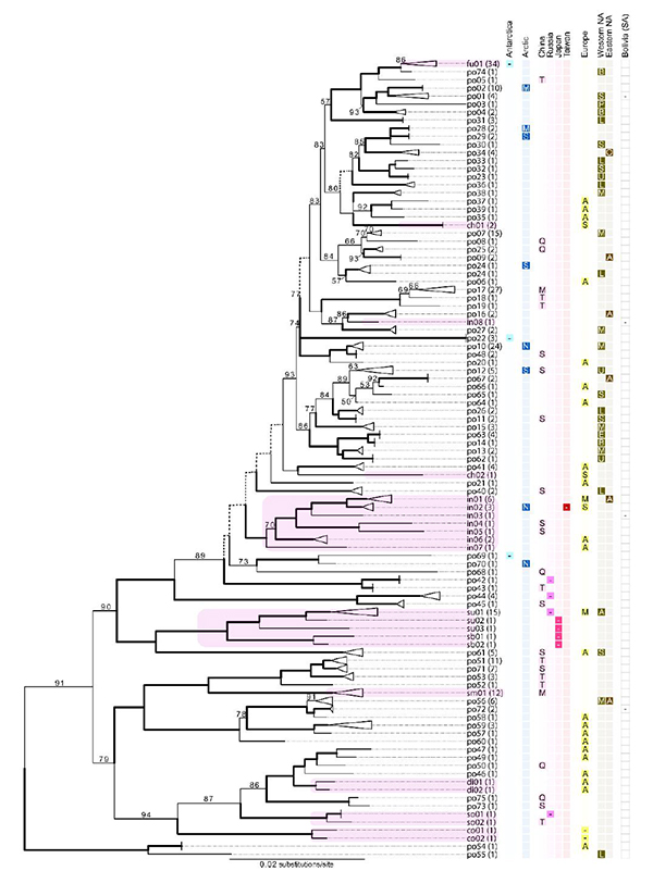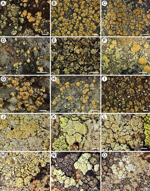 地衣型真菌是一类能与蓝细菌或藻类共生形成稳定有机体的特化真菌,其物种演化和分类界定仍在不断地探索中。茶渍科是地衣型真菌的第五大科,含1000余种,是地衣分类中问题最多、最为复杂的类群之一。其中,多形茶渍Lecanora polytropa (Hoffm.) Rabenh为世界广布种,不同材料间形态差异较大,使该种下亚种、变种和变型多达40余个。 图1 多形茶渍Lecanora polytropa复合群形态特征 中国科学院昆明植物研究所联合美国杨百翰大学、加拿大自然博物馆的科研人员,对采自亚洲、欧洲、北美洲和南美洲的300余份多形茶渍样品开展了物种界定研究。自主扩增的ITS序列结合GenBank的分子序列,采用ASAP和bPTP分析方法对多形茶渍复合群进行物种划分,ASAP分析结果显示该复合群包含62-103个种级分支,其中支持102-和103-个物种的计算模型获得ASAP的最佳得分;bPTP的物种划分结果为73个种级分支,与ASAP的结果基本一致。这些种级分支中仅10%左右为跨洲际分布。同时对该种复合群的五基因(ITS、nuLSU、RPB1、RPB2、mtSSU)系统发育分析显示:绝大多数ASAP获得的种级分支与多基因分析结果一致。在此基础上,研究人员选取了美国西部的32个代表样品进行简略基因组测序,基于1209个单拷贝核基因构建的系统发育树同样支持ASAP的物种划分结果;线粒体基因组分析检测到一个基因渐渗事件,其余种级分支也与ASAP的划分结果一致。 图2 基于ITS-nuLSU-RPB1-RPB2和mtSSU联合矩阵采用最大似然法构建的Lecanora polytropa group系统发育树,右侧分类群名称为ASAP划分的种级分支 文章首次从DNA层面揭示了多形茶渍复合群极其丰富的物种多样性,并对该复合群下潜在物种的地理分布进行了初步分析,为该类群的分类研究提供了新视野。多形茶渍复合群或可作为地衣型真菌谱系生物地理和物种形成研究的模式类群。 以上研究成果近日以Providing Scale to a Known Taxonomic Unknown—At Least a 70-Fold Increase in Species Diversity in a Cosmopolitan Nominal Taxon of Lichen-Forming Fungi为题在国际真菌期刊Journal of Fungi的地衣型真菌物种多样性、生态和进化历史特刊发表。中国科学院昆明植物研究所张雁云博士和美国杨百翰大学Jeffrey Clancy博士为论文共同第一作者,中国科学院昆明植物研究所王立松研究员和美国杨百翰大学Steven D. Leavitt副教授为论文共同通讯作者。上述工作得到国家自然科学基金面上项目(31970022、31750001),第二次青藏高原综合科学考察研究项目(2019QZKK0503),Canyonlands Natural History Association(Moab, UT, USA)和M.L. Bean Museum of Life Sciences at Brigham Young University(Provo, UT, USA)的经费支持。 |
