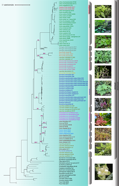 广义荨麻族(Urticeae sensu lato)包括12属共220余种,是荨麻科(Urticaceae)一个中等大小的族。该族植物以其独特的刺毛以及药用、食用和纺织等经济价值而闻名,具有很高的研究价值。然而,由于前人研究在取样和分子标记等方面的局限性,我们对荨麻族内的系统发育关系仍知之甚少。 近日,中国科学院昆明植物研究所李德铢团队依托中国西南野生生物种质资源库,通过基因组浅层测序获得荨麻族中已知全部属的质体基因组,探讨了其大小和结构变异。研究发现,荨麻族植物的质体基因组为典型的被子植物四分体结构,大小在145~161 kb之间,编码110~112个基因。在质体结构方面,重点关注了反向重复序列(IR)的扩张和收缩,trnN-GUU基因的倒位,rps19基因和rpl2内含子的丢失,以及多种重复类型的出现等变异。该研究鉴定了未来可用于该族植物DNA条形码研究的11个高度变异区域,这些变异可应用于分类学、分子标记开发、群体遗传学和系统发育等方面的研究。 在此基础上,基于该族12属58种共90个个体的基因组浅层测序数据,组装了叶绿体基因组和核糖体大亚基(nrDNA)序列,并据此重建了荨麻族内部的系统发育关系。通过结合GenBank已公开的数据,一共获取了荨麻族12属130种植物的trnL-F和ITS序列开展了更大范围的系统发育关系重建分析。结果显示,叶绿体系统发育基因组学分析在很大程度上理清了荨麻族内的系统发育关系,支持该族为单系类群,并且发现该族除了艾麻属(Laportea)、Urera和荨麻属(Urtica)外,其余属均为单系。此外,分析结果也对以往有争议的分支有了清晰的阐明,即:(1)蝎子草属是Dendrocnide-Discocnide-Laportea-Nanocnide-Zhengyia-Urtica-Hesperocnide分支的姐妹类群;(2)锥头麻属是狭义Urera的姐妹类群。基于ITS和trnL-F序列构建的系统发育树支持率相对较低,但与叶绿体基因组和核糖体大亚基建树的结果基本一致。该研究明晰了基因组浅层测序在厘清荨麻族系统发育关系的潜力,为荨麻族系统发育关系重建提供了新证据,并为该族的生物地理学研究打下坚实基础。 该研究成果以Deep insights into the plastome evolution and phylogenetic relationships of the tribe Urticeae (family Urticaceae)为题在线发表于国际植物学期刊《植物科学前沿》(Frontiers in Plant Science)。中国科学院昆明植物研究所肯尼亚籍硕士研究生Catherine A. Ogoma为论文第一作者,吴增源副研究员和李德铢研究员为通讯作者。本研究得到了中国科学院B类先导专项(XDB31000000)、国家自然科学基金项目(31970356, 41571059, 41971071)和中国科学院青年创新促进会(2019385)等的资助。