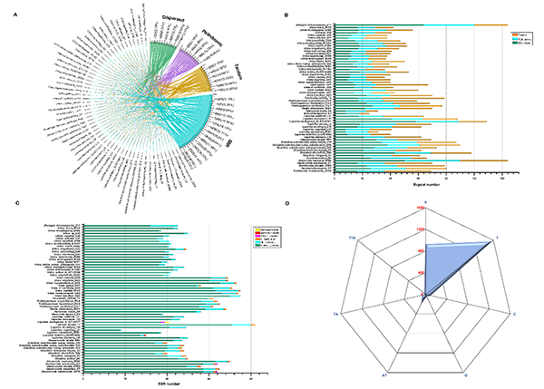 图1 基于质体基因组和nrDNA构建的荨麻族系统发育关系 图2 荨麻族质体基因组结构变异分析。A,荨麻族代表种和它们对应的重复类型(分散,回文,串联和SSR)之间的关联; B,串联、回文和分散重复出现的频率; C,6个SSR核苷酸的数量; D,荨麻族质体基因组中最丰富的7个SSR序列。 |