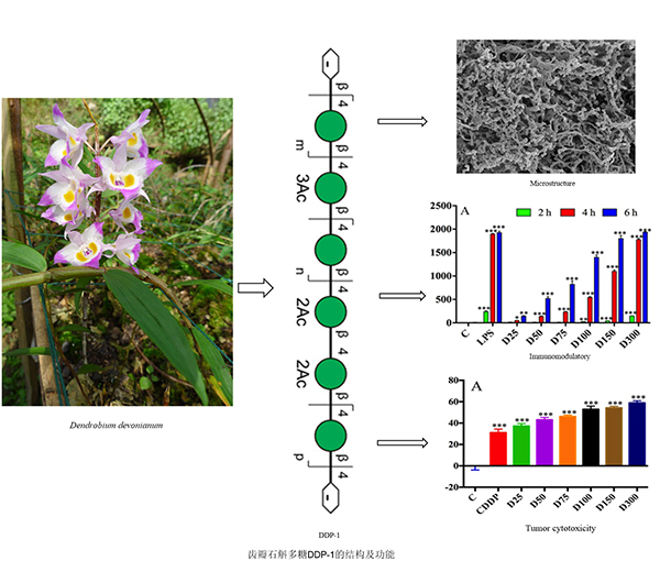 石斛属植物(Dendrobium)是兰科(Orchidaceae)植物最大的属,约有1500余种,分布于亚洲、欧洲及澳大利亚等热带和亚热带地区,分布于我国南方地区的药用石斛有30余种。云南省是石斛种植大省,主要种植的石斛品种有铁皮石斛、齿瓣石斛、鼓槌石斛等。相较于铁皮石斛的研究报道,齿瓣石斛的药学研究工作相对较少,齿瓣石斛多糖的结构及功能都不是很清晰,阻碍了地方产业发展。围绕齿瓣石斛基础物质构成和功能活性成分发掘等基础研究工作,将更好的为齿瓣石斛产业发展提供科技支撑。因此,探索齿瓣石斛多糖结构特征及其活性表现对活性天然产物发掘以及地方产业发展均具有重要意义。