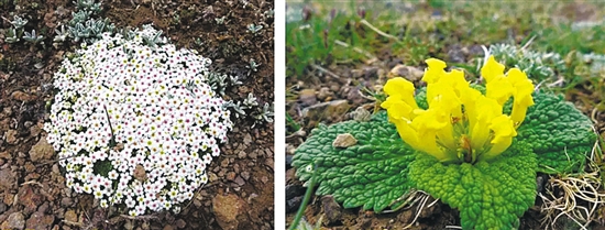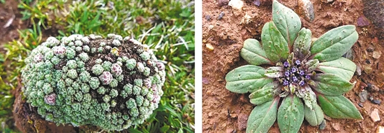 开花多但花较小的垫状点地梅(左)和藏玄参(右) 摄影/杨永平