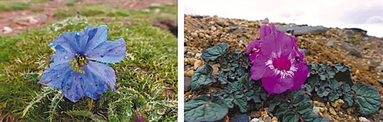 开花少但花大的多刺绿绒蒿(左)和藏波罗花(右) 摄影/杨永平
