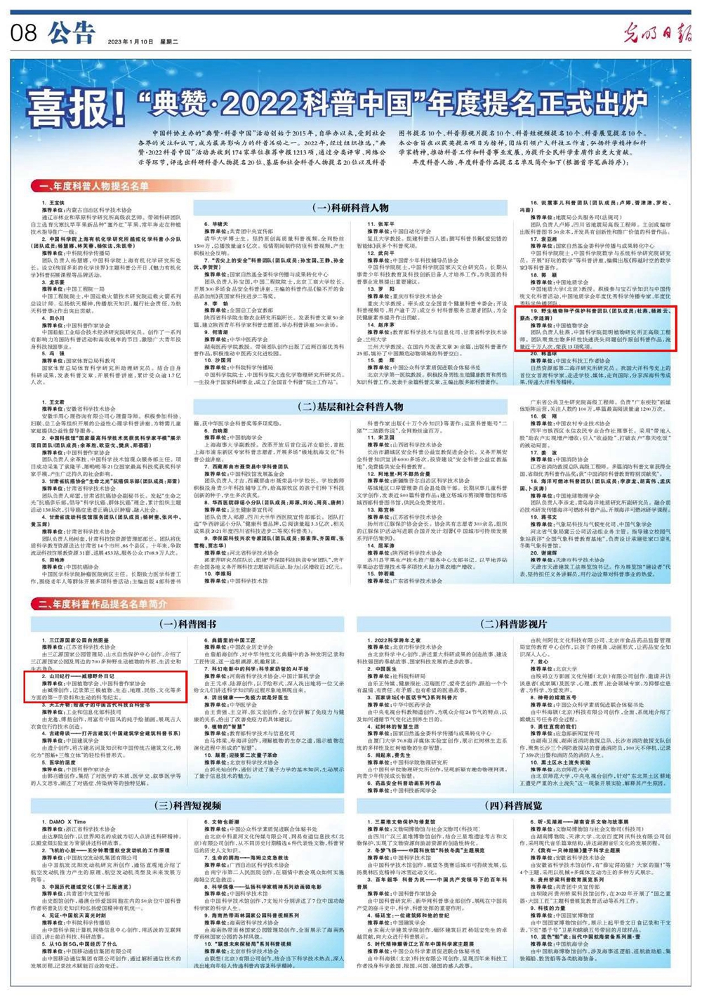 由云南省植物学会积极组织申报,经中国植物学会推荐,中国科学院昆明植物研究所科普团队和科普作品从174家单位推荐申报的1213个项目中脱颖而出,获中国科协主办的“典赞·2022科普中国”活动提名。其中,“野生植物种子保护科普团队” 荣获“年度科普人物提名”,黎兴江、刘培贵、杨祝良等编辑出版的《山川纪行——臧穆野外日记》荣获“年度科普作品提名”。