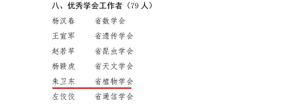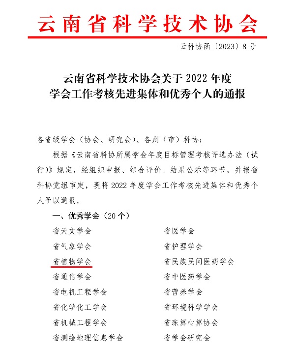 2023年3月,云南省科学技术协会印发了《云南省科学技术协会关于2022年度学会工作考核先进集体和优秀个人的通报》(云科协函[2023] 8号),云南省植物学会在省科协的业务指导下,在理事会、专业委员会、工作委员会和会员的协力支持下,荣获2022年度“优秀学会”称号,学会秘书长朱卫东荣获“优秀学会工作者”称号。