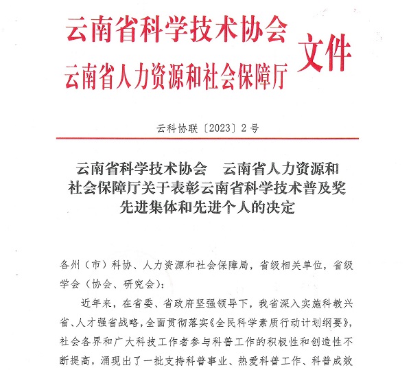 2023年2月,根据《云南省科学技术协会 云南省人力资源和社会保障厅 关于表彰云南省科学技术普及奖先进集体和先进个人的决定》(云科协联[2023] 2号)文件,云南省植物学会科学传播工作委员会委员刘光裕、学会副秘书长杨云珊荣获“云南省科学技术普及奖先进个人”称号。