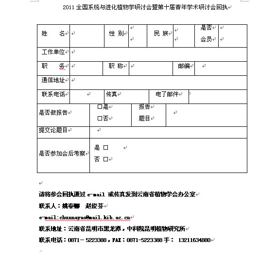 投稿请通过云南省植物学会e-mail:chunayao@mail.kib.ac.cn提交,邮件主题请注明:“2011 年全国系统与进化会议投稿”。并附上你的联系地址、邮编和电话,以及e-mail地址,以便我们进一步联系。投稿截止日期:2011年9月25日