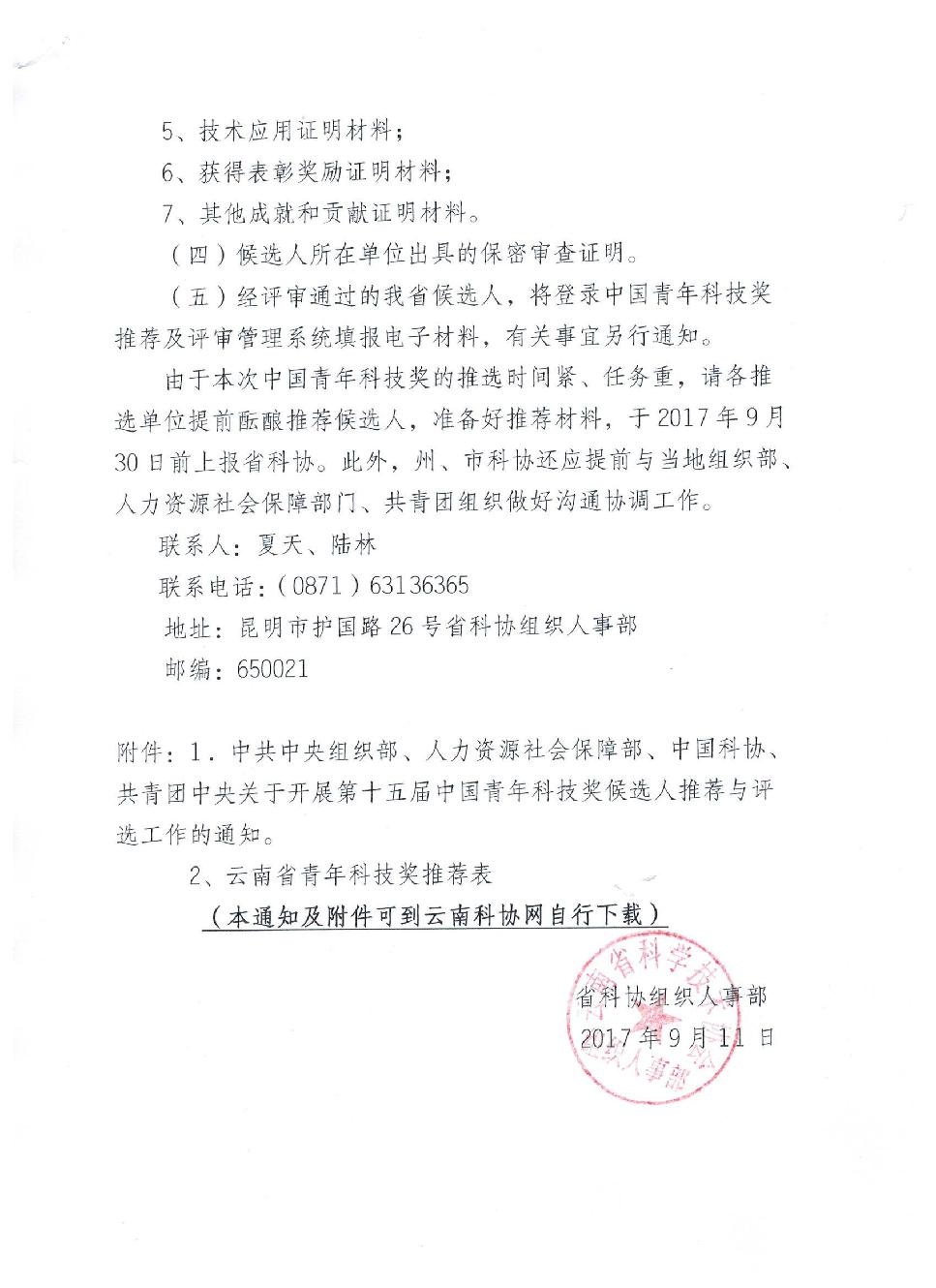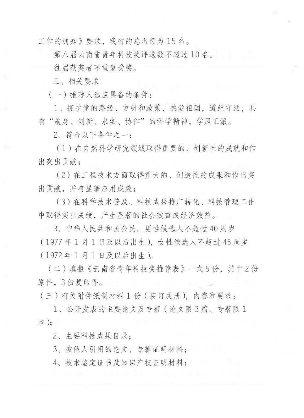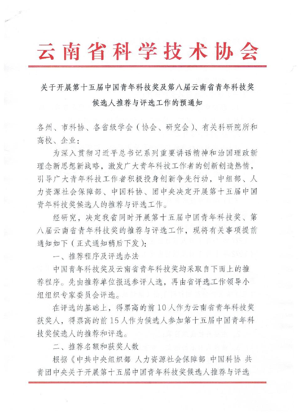关于开展第十五届中国青年科技奖及第八届云南省青年科技奖候选人推荐与评选工作的预通知