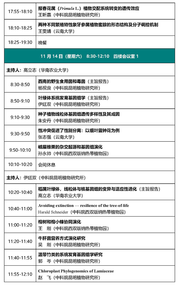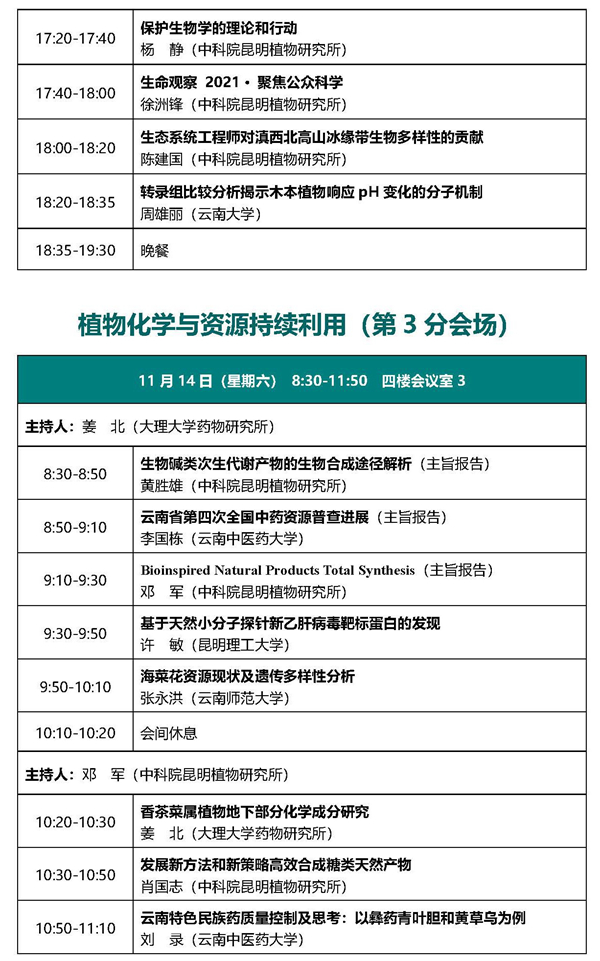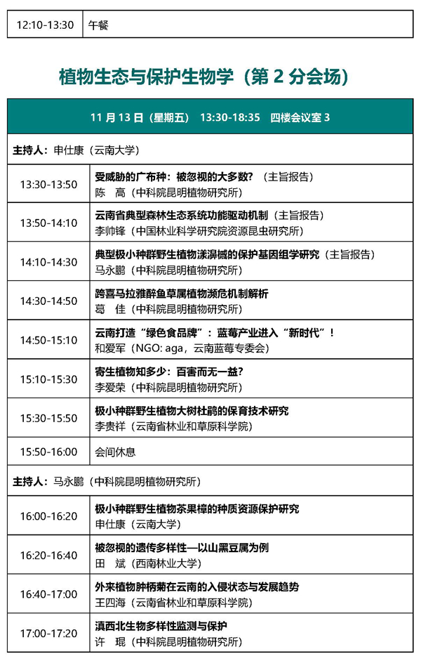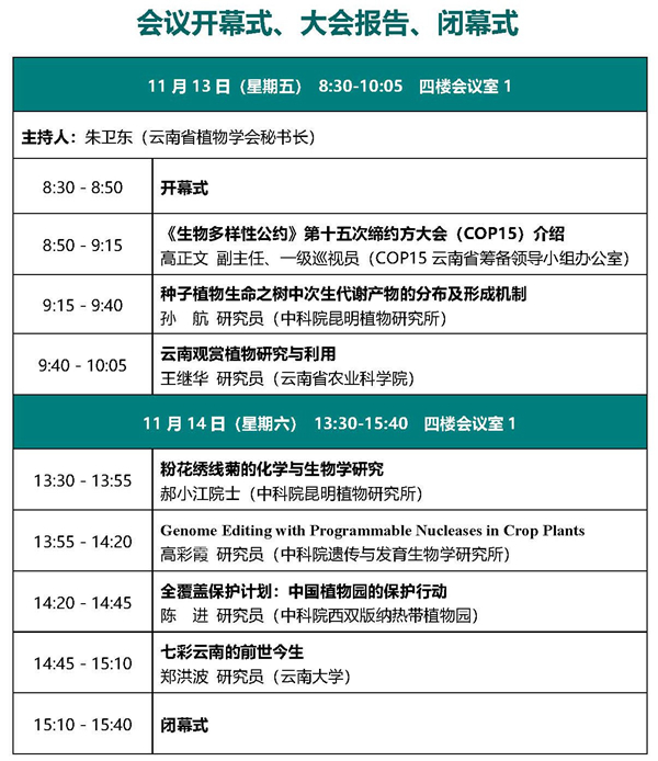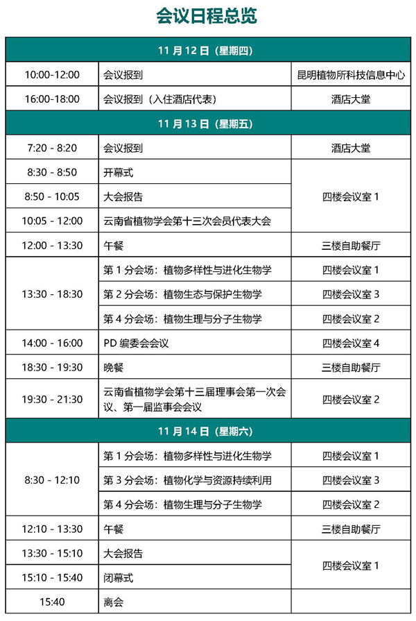 2. 接送安排 会议将安排2辆大巴车负责昆明植物所至会场的往返接送。发车时间: 11月13日 7:30,昆明植物所1号门-会场;20:00,会场-昆明植物所 11月14日 7:30,昆明植物所1号门-会场;16:00,会场-昆明植物所 七、会议须知 1. 根据新冠疫情常态化防控的要求,请各位会议代表做好防护准备,进入会场测体温,使用手机出示云南健康码绿码标识。会议室内请佩戴口罩。 2. 参会胸牌是全程参会的唯一有效凭证,请妥善保存并在会议全程随身携带。 3. 会议报告PPT推荐尺寸16:9,请报告人提前将PPT报告交由主会场及分会场联系人拷贝至会议电脑。为尊重知识产权,会议期间不提供PPT报告拷贝服务,有需要者请在会后直接与报告人联系。 4. 进入会场请将移动电话设置为会议模式,注意维护会议秩序,保管好贵重物品。 八、大会微官网 会议最新资讯、日程等信息及会议资料下载,均通过会议网站和微官网进行发布,请扫描二维码,并收藏以备随时查询。