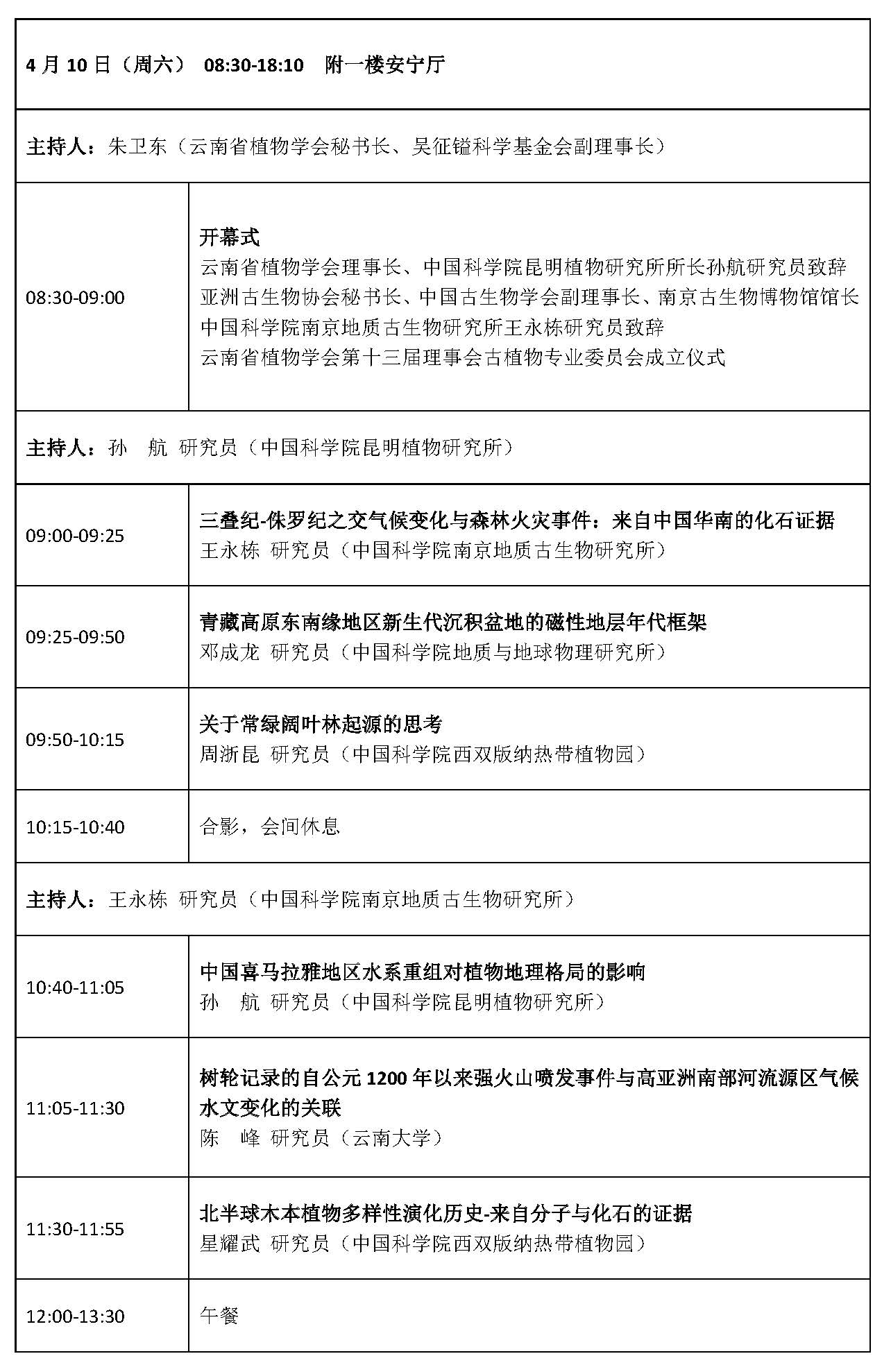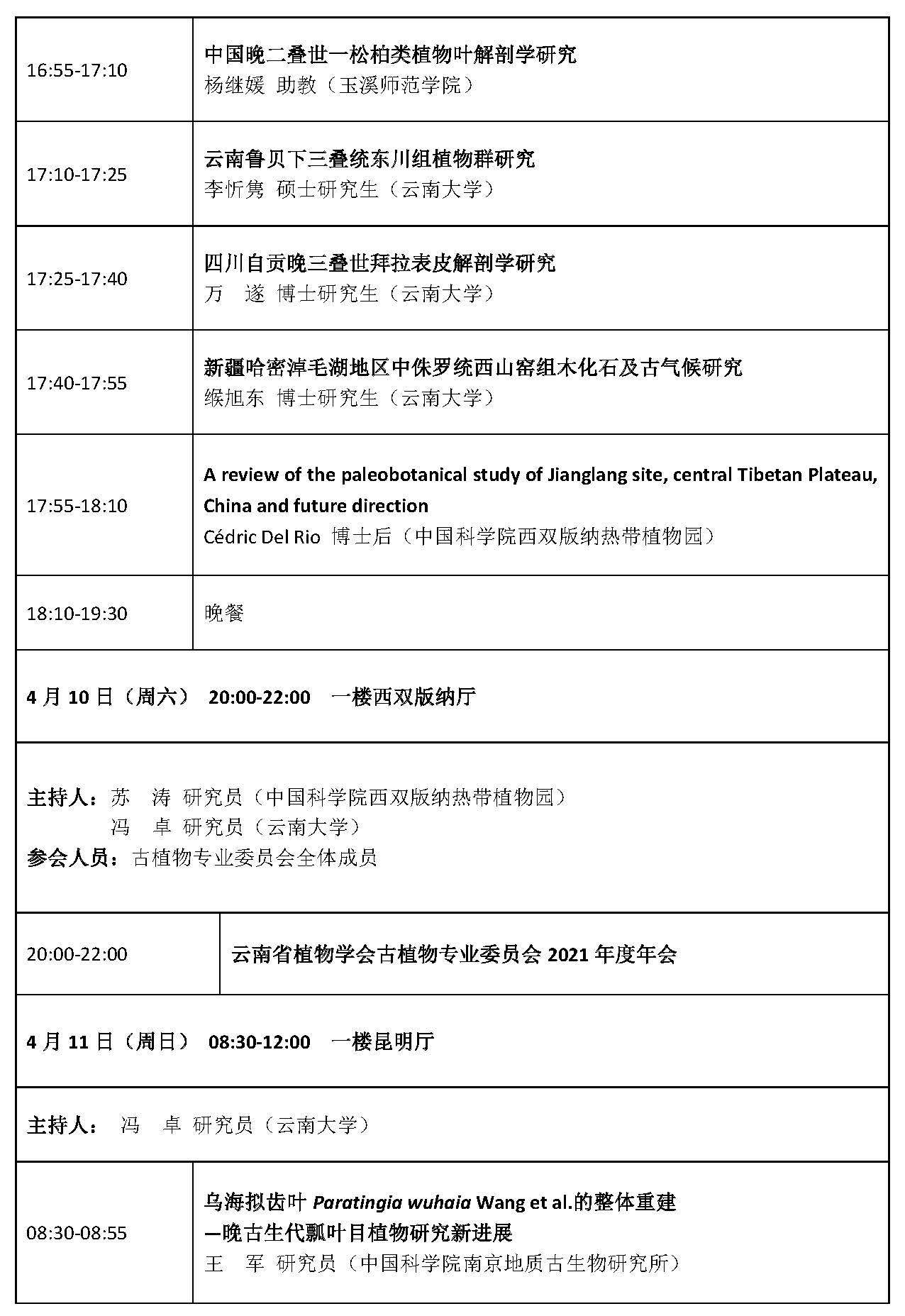 一、会议主题 古植物学:多学科交叉的机遇与挑战 二、会议时间:2021年4月9日-11日 三、会议地点:安宁市广晟泌园酒店 四、报到时间和地点:4月9日14:00-20:00 酒店大堂 五、会议日程