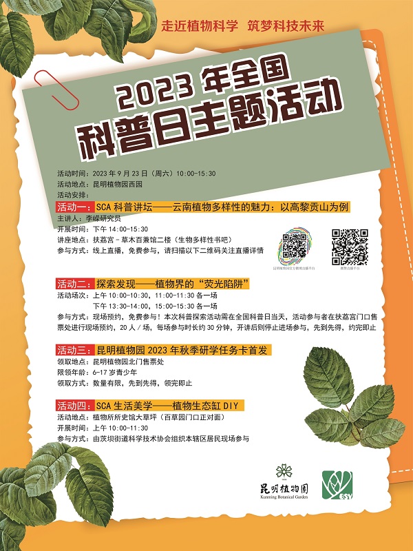 昆明植物园与云南省植物学会长期致力于植物科研保育,围绕美丽中国建设,普及生态文明知识,倡导绿色、低碳、节约的生态理念,服务绿色发展,促进人与自然和谐共生,将共同举办“走近植物科学 筑梦科技未来” 2023年全国科普日主题活动,让科技工作者引领科学教育,倡导科学理念,立足公众所需,服务创新发展,特别是激发更多的青少年热爱科学,参与到生物多样性的保护与发展中。