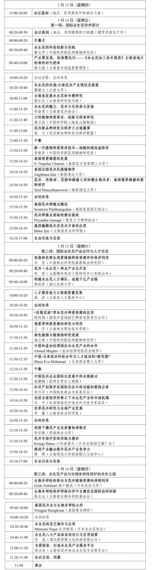 为进一步促进国际花卉及生物多样性相关产业的可持续和高质量发展,定于3月13日-16日在中国科学院昆明植物研究所举办“2025第一届国际永生花系列学术研讨会”。会议将围绕永生花技术创新与技术进步、国际合作与人才交流、生物多样性与未来发展趋势展开交流与研讨。会议的宗旨是:推动永生花产业技术创新,促进产业的交流与合作,提升行业标准和影响力,推动产业的高质量发展。 感谢您对本次会议的关注与支持!现将具体会议事项通知如下: 1. 第一场:“七彩云南·创新绽放”国际永生花学术研讨。聚焦花卉产业技术的最新研究成果与创新应用,分享国内外前沿技术与实践经验,促进学术交流与合作。 2. 第二场:“花语智汇·共谋发展”国际永生花产业合作与人才交流。探讨花卉产业的合作机遇与挑战,搭建产业交流平台,促进人才流动与培养,共同推动产业繁荣发展。 3. 第三场:“守护多样生命·创造共同价值”永生花产业与生物多样性保护的共生之路。深入讨论花卉产业与生物多样性保护之间的平衡与共生关系,探索可持续发展的路径,为地球生命的多样性贡献力量。 二、组织机构 主办单位:中国科学院昆明植物研究所 承办单位:云南省东南亚研究会 协办单位:云南省植物学会芳香植物专业委员会 云南省花卉协会永生花专业委员会 时间:2025年3月13日-16日 地点:中国科学院昆明植物研究所行政楼三楼学术报告厅 (云南省昆明市盘龙区蓝黑路132号) 为确保会议有序开展,请您务必知悉并严格遵照时间安排,准时完成报到流程。 3月13日 13:00-20:00 昆明晟世仟和酒店大堂(地址:昆明市盘龙区龙泉街道沣源路小康大道路口) 3月14日 08:20-08:50 昆明植物所行政楼三楼学术报告厅外 以下酒店可享受会议协议价: 1. 昆明晟世仟和酒店 地址:云南省昆明市盘龙区沣源路与小康大道交叉口 电话:0871-65239666 地址:云南省昆明市盘龙区龙溪路99号 电话:0871-63565555 地址:云南省昆明市五华区小康大道中段银河北庭7号楼 电话:0871-64123333 六、会议日程