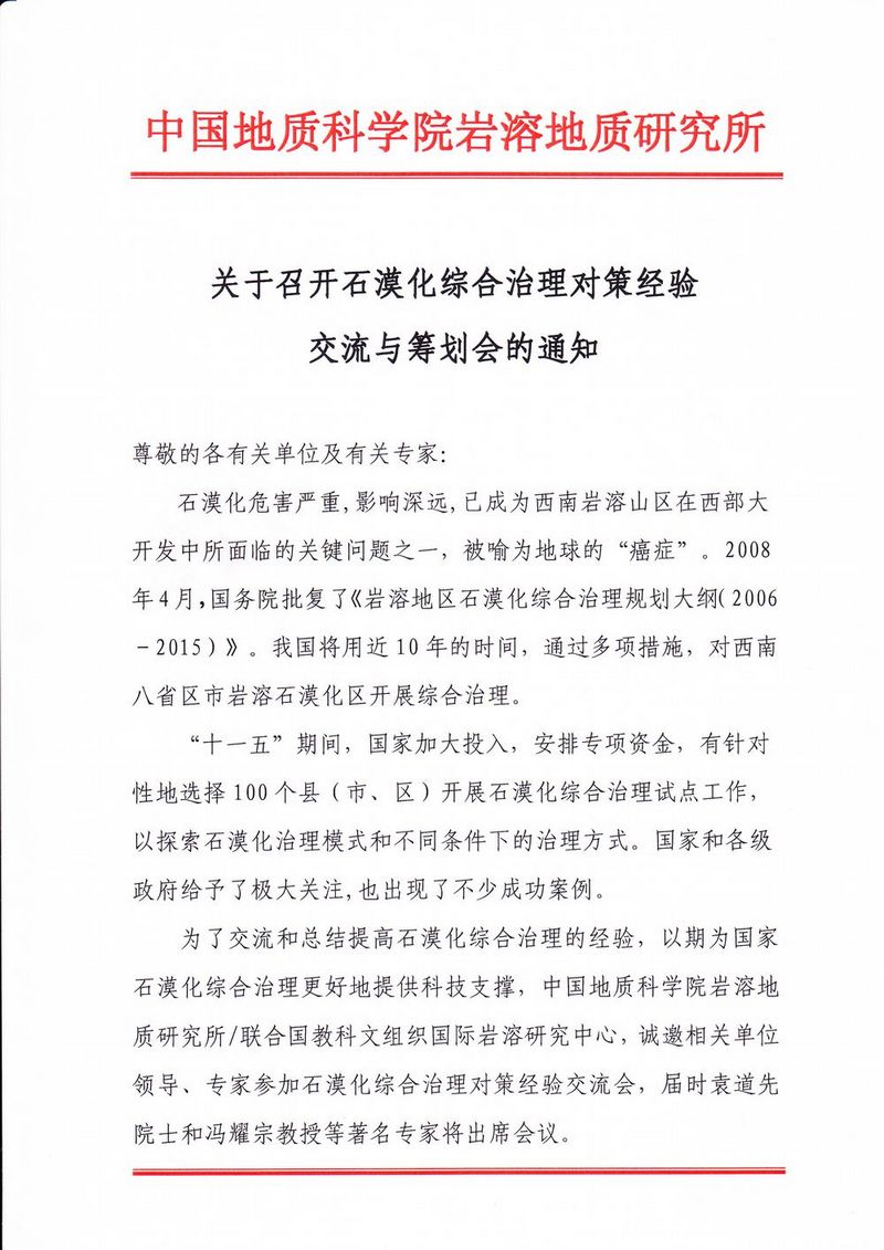 十二五马上来临,石漠化综合治理问题已经变得越来越重要,国家也越来越重视。“十一五”期间,国家加大通入,安排专项资金,有针对性地开展石漠化综合自理试点工作。为了交流和总结提高石漠化综合治理的经验,以期为国家石漠化综合治理更好地提供科技支撑。诚邀您在新年百忙当中参与筹划或派代表参加经验交流,我们真诚期待您的光临指导!