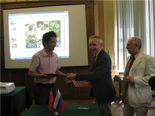 中俄双方举行了会谈,俄罗斯植物学会副理事长lenoid Averyanov教授代表俄罗斯植物学会参加了会议。刘吉开和柯马洛夫植物所副所长D. V. Geltman博士分别介绍了两所的基本情况及最近的科研进展,刘吉开还转达了昆明植物所所长、云南省植物学会理事长李德铢研究员关于加强和提升双方全面合作的倡议。中俄双方就项目合作研究、人员互访、标本交换和鉴定、种质资源保藏等方面交换了意见并进行了广泛深入的交流。刘吉开副所长代表昆明植物所、Geltman副所长代表柯马洛夫植物所,刘吉开副理事长代表云南省植物学会、Lenoid Averyanov代表俄罗斯植物学会分别签订了合作备忘录,为进一步加强两所及学会间的交流合作奠定了基础。备忘录签订后,双方科学家们在香槟酒会上进行了轻松愉快的交流。随后,昆明植物所代表参观了柯马洛夫植物园和相关研究室,柯马洛夫植物园给中方人员留下了深刻的印象。