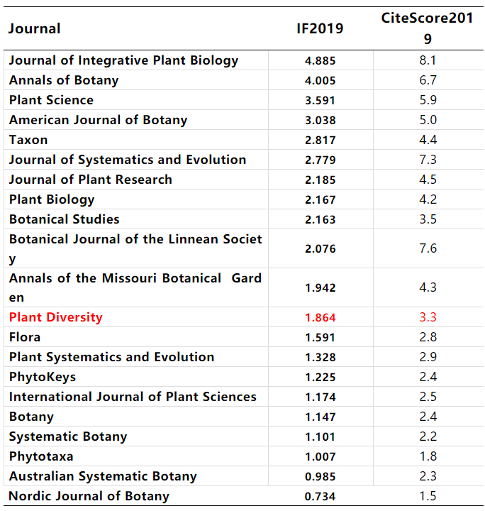 2020年6月29日晚,最新的《期刊引用报告》(Journal Citation Reports)影响因子(Impact Factor)终于出炉。由中国科学院昆明植物研究所和中国植物学会共同主办的英文期刊《植物多样性》(Plant Diversity)获得首个影响因子:1.864!在植物科学学科234种期刊中排名第96位(42%;Q2分区)。 据悉,国际出版集团爱思唯尔(Elsevier)旗下的Scopus数据库发布的CiteScore 2019(https://www.scopus.com/sources),《植物多样性》(Plant Diversity)2019年CiteScore为3.3,较去年(CiteScore2018: 2.0)增长65%,在植物科学学科431期刊中排名第113位,在生态、进化、行为和系统学学科629期刊中排名第189位(https://www.scopus.com/sourceid/21100871606#tabs=0)。 植物科学领域相关较熟悉的期刊 2019年IF和CiteScore统计如下: