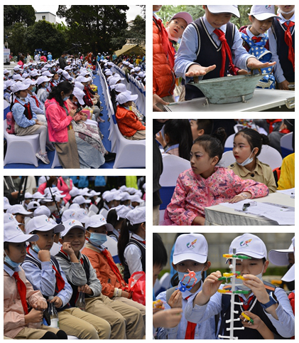 领导致词 在9月18日的启动仪式上,盘龙区领导和云南省植物学会代表分别致辞。在精彩的机器人表演和盘龙小学带来的科普话剧节目《保护我们共同的家园》精彩演出赢得的阵阵掌声中,活动正式拉开帷幕。在活动现场,盘龙区科协展出了20件科普仪器,科技感十足,深深吸引了盘龙小学的同学们和到园参观的游客。为了让更多人参与到科普活动中,现场还设置了科普灯谜猜猜猜互动体验区,通过猜灯谜的形式,进行科学普及。