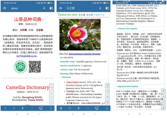 全球首个山茶品种电子词典初版自2018年发布以来,深受广大山茶爱好者、科研工作者的喜爱,该电子词典的新版本以中国科学院昆明植物研究所开发的世界山茶属植物品种数据库为数据源,采用html语言编写,unicode编码,可跨平台使用,在个人电脑、安卓手机和苹果手机均可同时使用。新版本山茶品种词典共记录了54042个品种名,包含24,051个接受名,29,991个异名、中文名、日文名、错误名等其它名称。除了收录茶花品种之外,还收录了茶叶和油茶的品种,是世界上最全的山茶属品种的电子词典。词典的发布与推广使用,将极大地便利广大山茶属植物工作者查询品种来源、特征、培育者、学名、异名、发表的刊物等信息,可有效避免出现异物同名问题,规范山茶花产业的名称使用。 该词典免费使用。如果在使用过程中,发现有未收录的名称、有任何错误,或者有任何建议或者意见,请关注“昆明植物园”微信公众号留言,或发送邮件至icr@mail.kib.ac.cn。除了山茶词典,Mdict还有很多词库,超过2000本,包括牛津字典、朗文字典、新华字典、世界上各种文字的各类词典(比如维基百科、医学词典、生物学词典、中国植物志、鱼类、鸟类词典等等,一旦使用,你会爱不释手)。