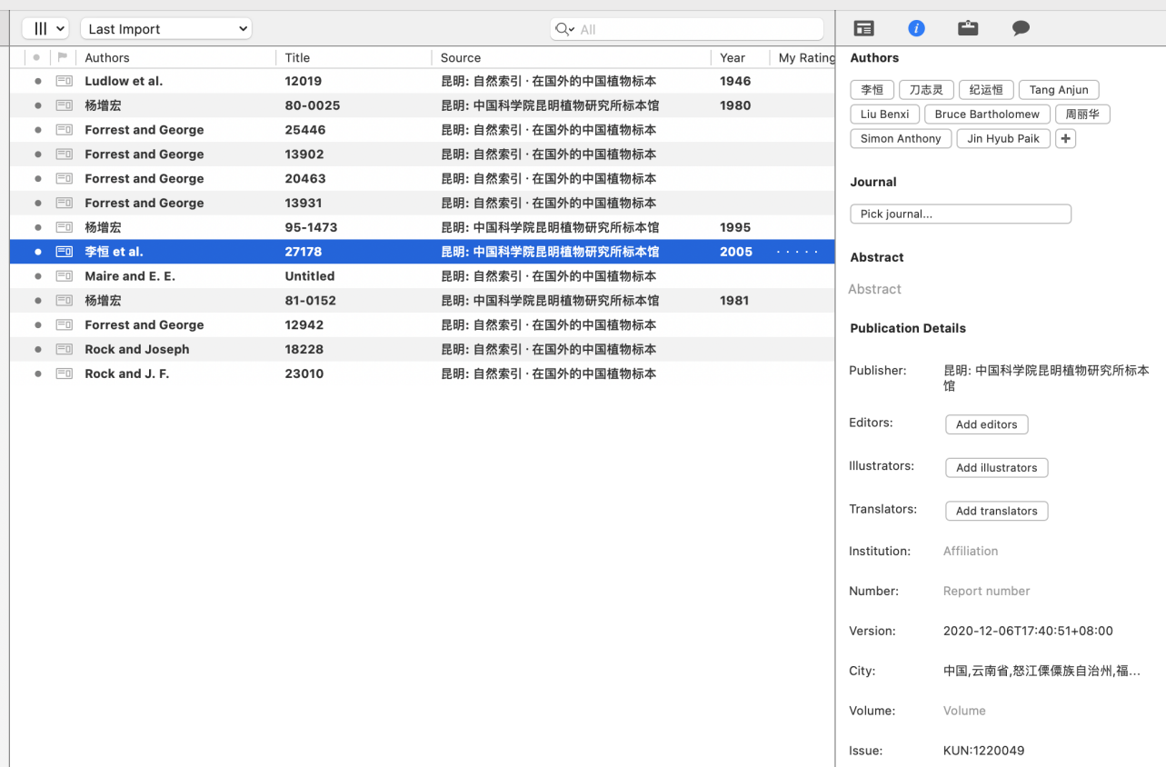 NOI 不仅可以生成引文,还可以将多个引文打包为 BibTex 文件,该文件可以被导入到常用的文献管理软件中,从而可以像管理文献一样管理标本资源。