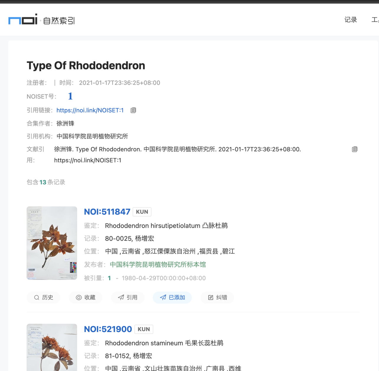 这里演示了将多份杜鹃花属模式标本合并为一个合集,该合集具有唯一的 NOISET 标识符和访问链接,同时还会生成规范的文献引文: