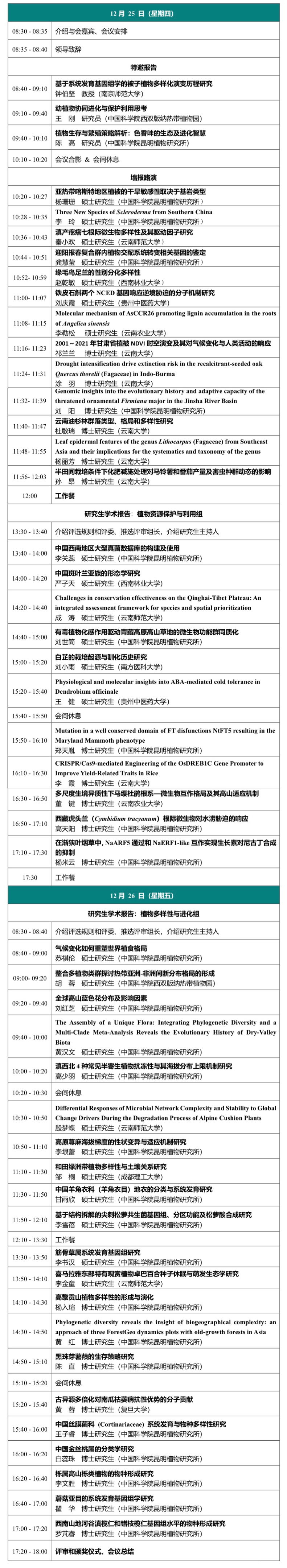 为纪念我国著名植物学家吴征镒院士,弘扬其严谨治学、执着追索的科学精神,活跃植物分类与系统进化、植物多样性与资源利用研究领域研究生的学术氛围,给青年学者搭建一个展现自我、学习交流的机会平台,提升青年学者及研究生的科研视野和学术与交流能力,由云南吴征镒科学基金会主办,中国科学院昆明植物研究所东亚植物多样性与生物地理学重点实验室和研究生处承办的“第十一届吴征镒生物多样性青年学术论坛”将于2025年12月25日-26日在昆明举办。 论坛邀请到吴征镒植物学奖创新奖获奖者和本领域专家作学术报告,来自全国多家科研院所和高校的45名在读研究生将参加口头报告讲演和墙报路演,由评审专家现场评分,评选出一、二、三等奖和优秀奖若干名。 欢迎相关领域科研人员参加会议! 一、会议时间和地点 时间:2025年12月25日-26日 地点:昆明植物研究所 行政楼三楼学术报告厅 二、会议日程